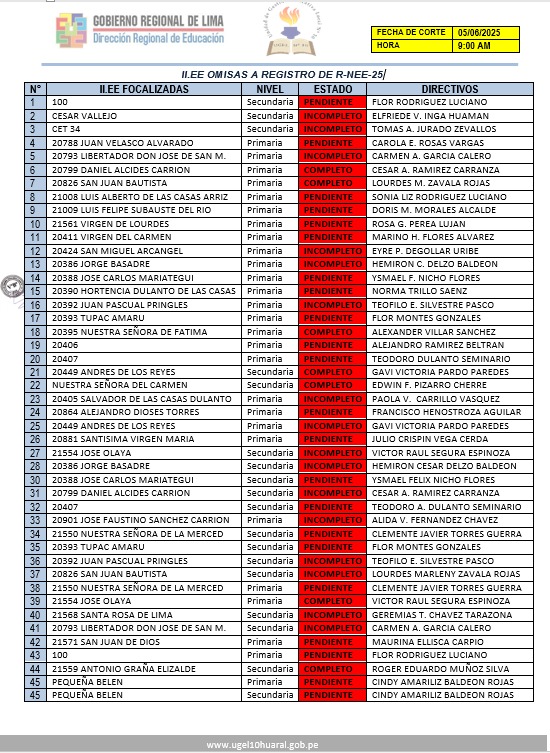 05 Jun,2025 Comunicados COMMENTS LISTA DE II. EE. OMISAS A REGISTRO DE R-NEE-25 Se solicita que se cumpla con el registro de manera urgentemente.
