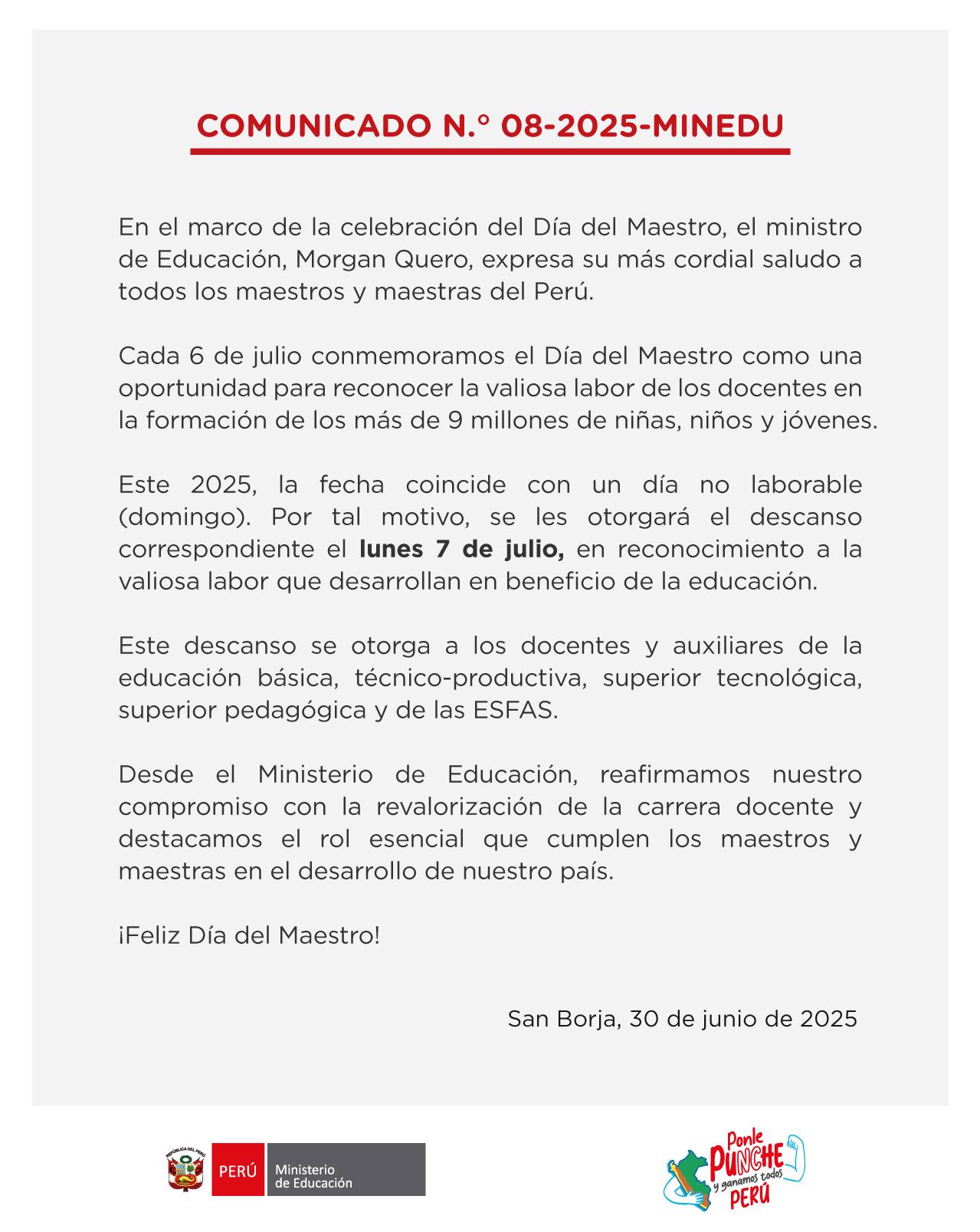02 Jul,2025 Comunicados COMMENTS COMUNICADO MINEDU – DÍA DEL MAESTRO ✅️ OFICIO MÚLTIPLE ➡️ https://drive.google.com/file/d/1JG-Gtqo0f7WVi_iYno5cgQ3XDUEW7AD4/view?usp=sharing