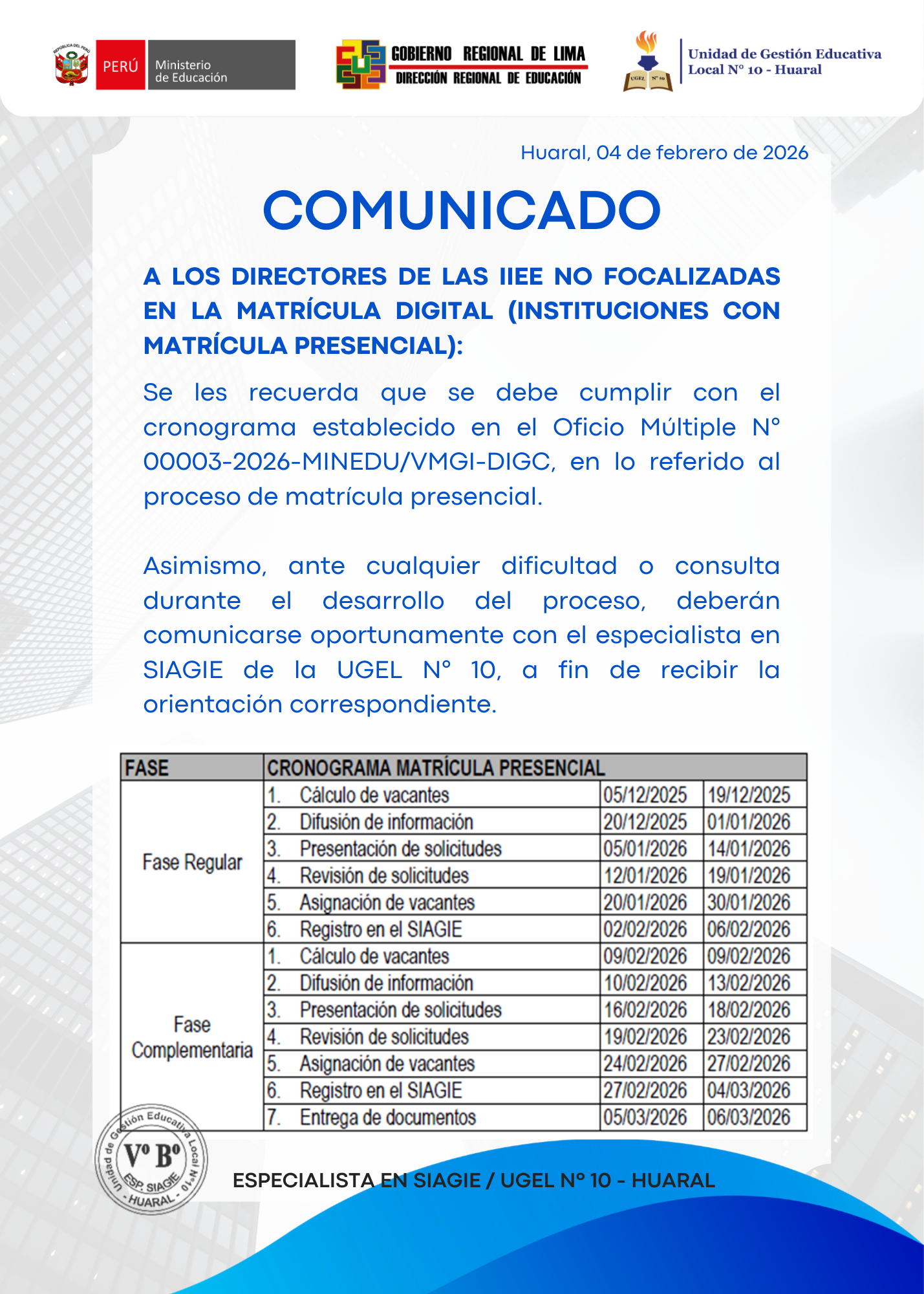 04 Feb,2026 Comunicados COMMENTS COMUNICADO: A los directores de las IIEE no focalizadas en la Matrícula Digital (Instituciones con matrícula presencial)