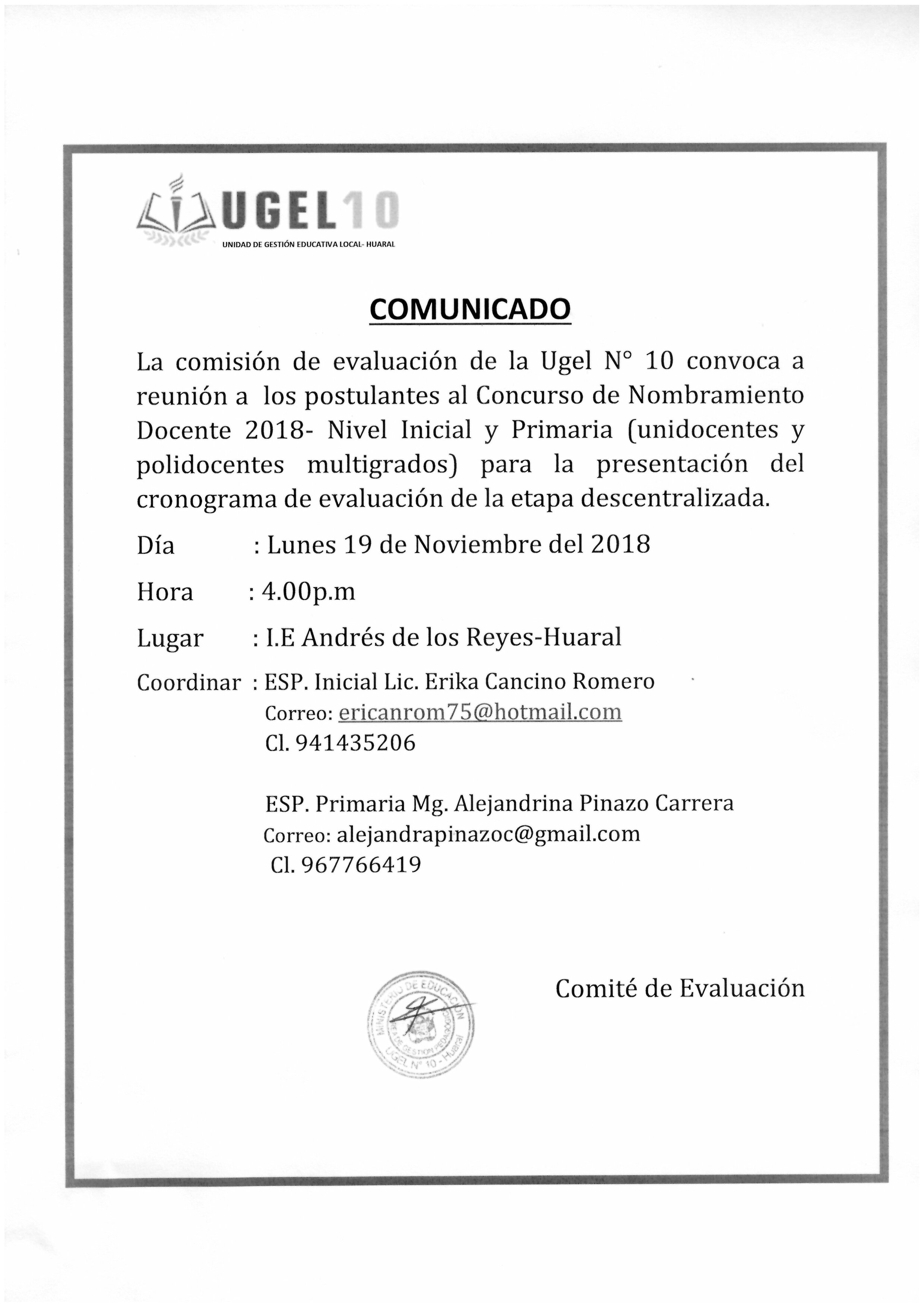 16 Nov,2018 Comunicados COMMENTS REUNIÓN A LOS POSTULANTES AL CONCURSO DE NOMBRAMIENTO DOCENTE-2018 NIVEL INICIAL Y PRIMARIA.