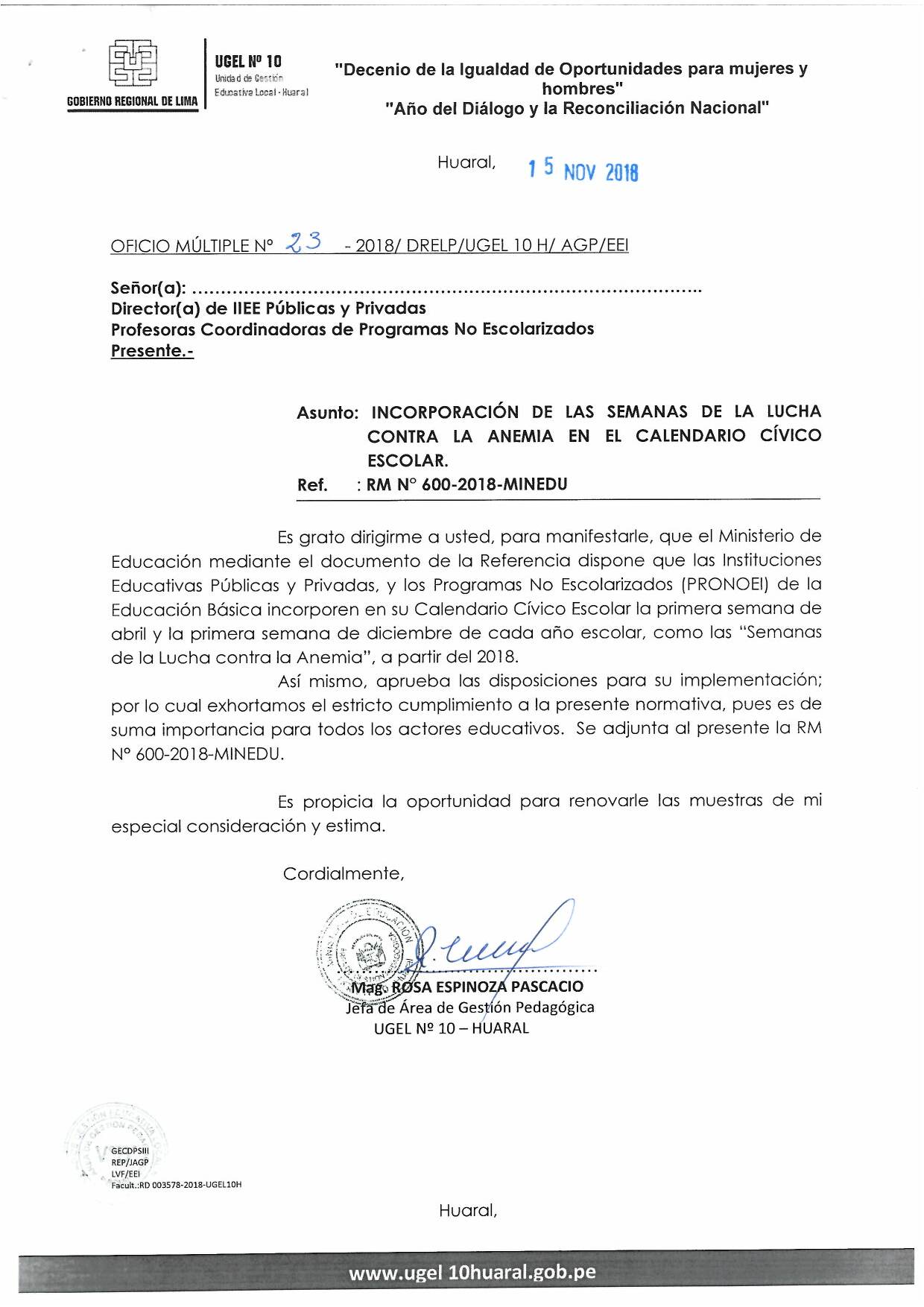 16 Nov,2018 Comunicados COMMENTS INCORPORACIÓN DE LAS SEMANAS DE LA LUCHA CONTRA LA ANEMIA EN EL CALENDARIO CÍVICO ESCOLAR. VER ANEXO