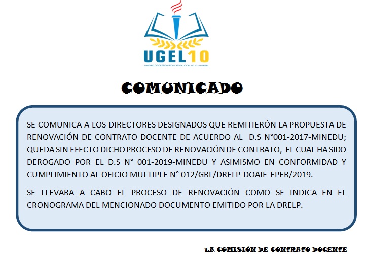 Horarios de atención UGEL N°10: Lunes a Viernes de 08:30 a.m. - 12:30 p.m. y de 14:00 p.m. - 16:30 p.m.