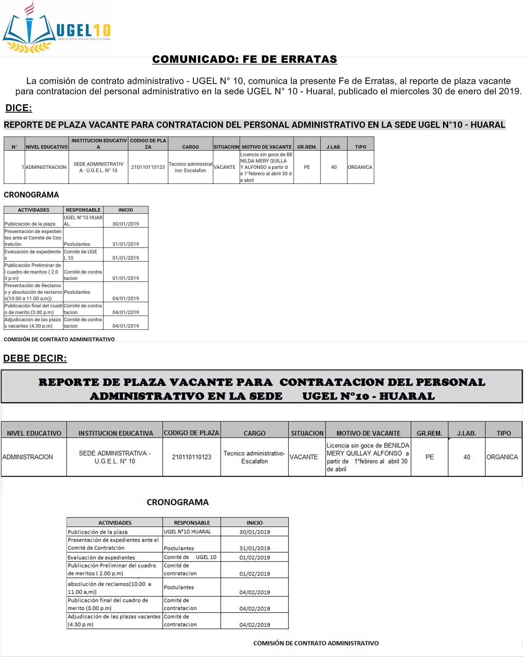 31 Ene,2019 Comunicados COMMENTS FE DE ERRATAS: REPORTE DE PLAZA VACANTE DE CONTRATACIÓN DEL PERSONAL ADMINISTRATIVO EN LA SEDE UGEL N° 10 - HUARAL.