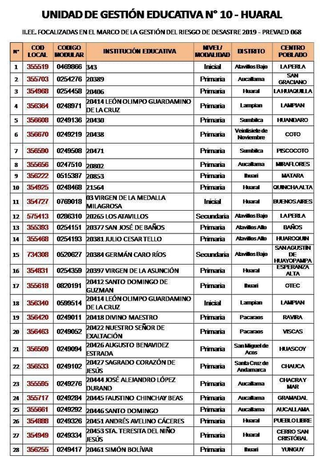 13 Feb,2019 Comunicados COMMENTS II.EE Focalizadas en el marco de la Gestión de Desastre 2019 - PREVAED 068.