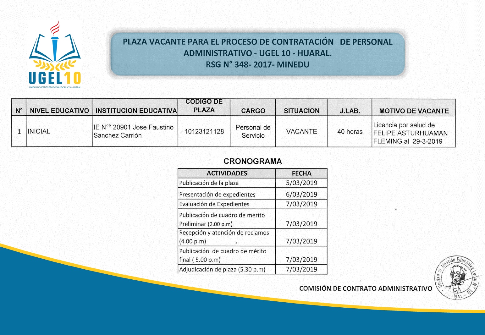 05 Mar,2019 Convocatorias COMMENTS Plaza Vacante para el Proceso de Contratación de Personal Administrativo en I.E