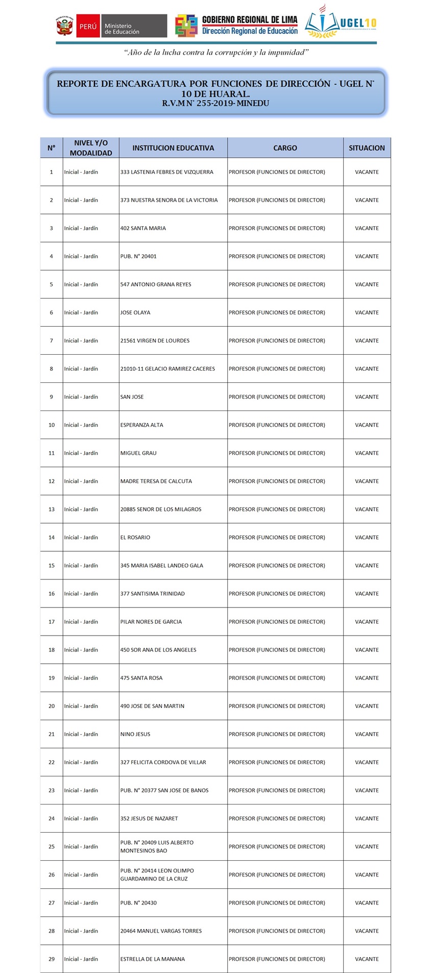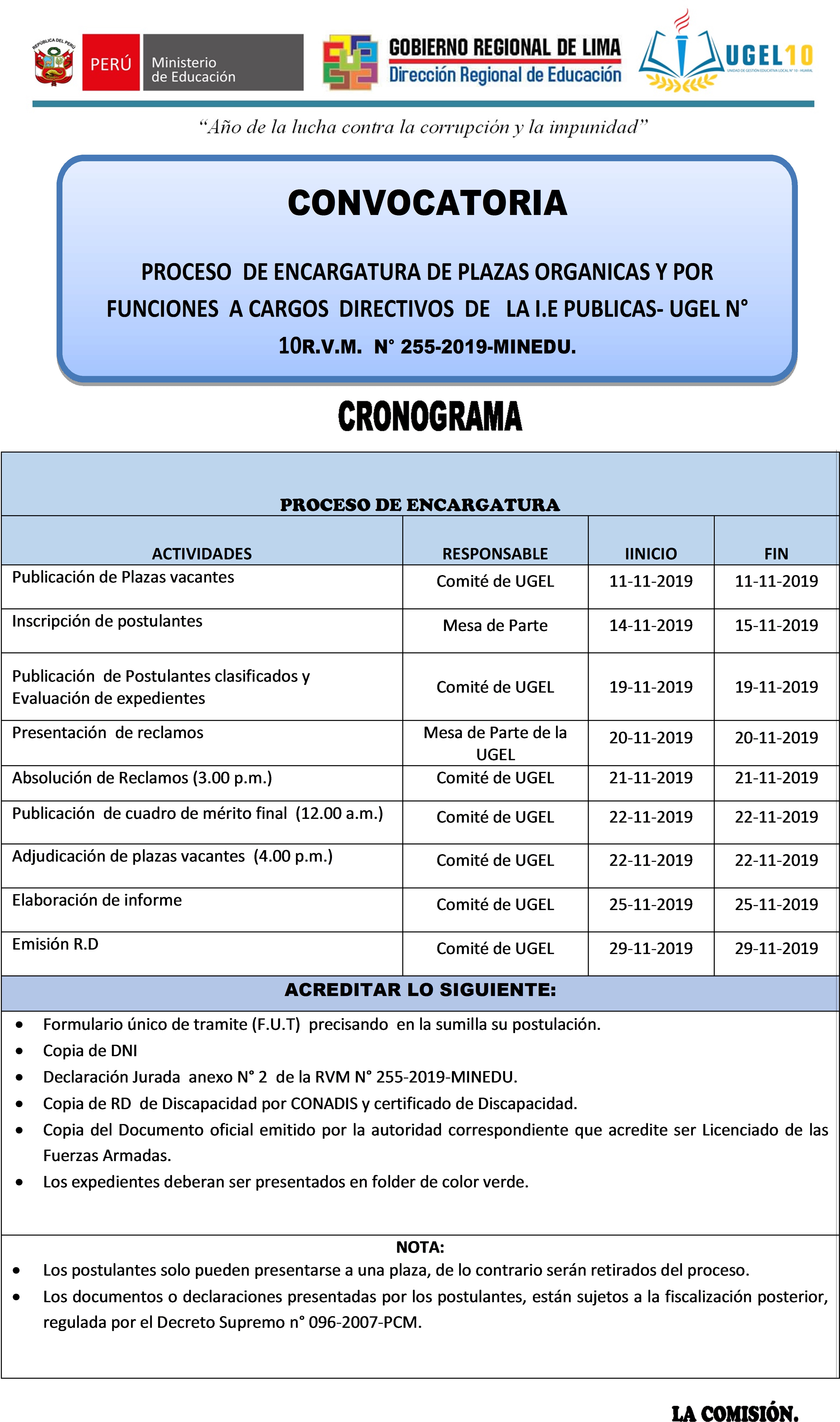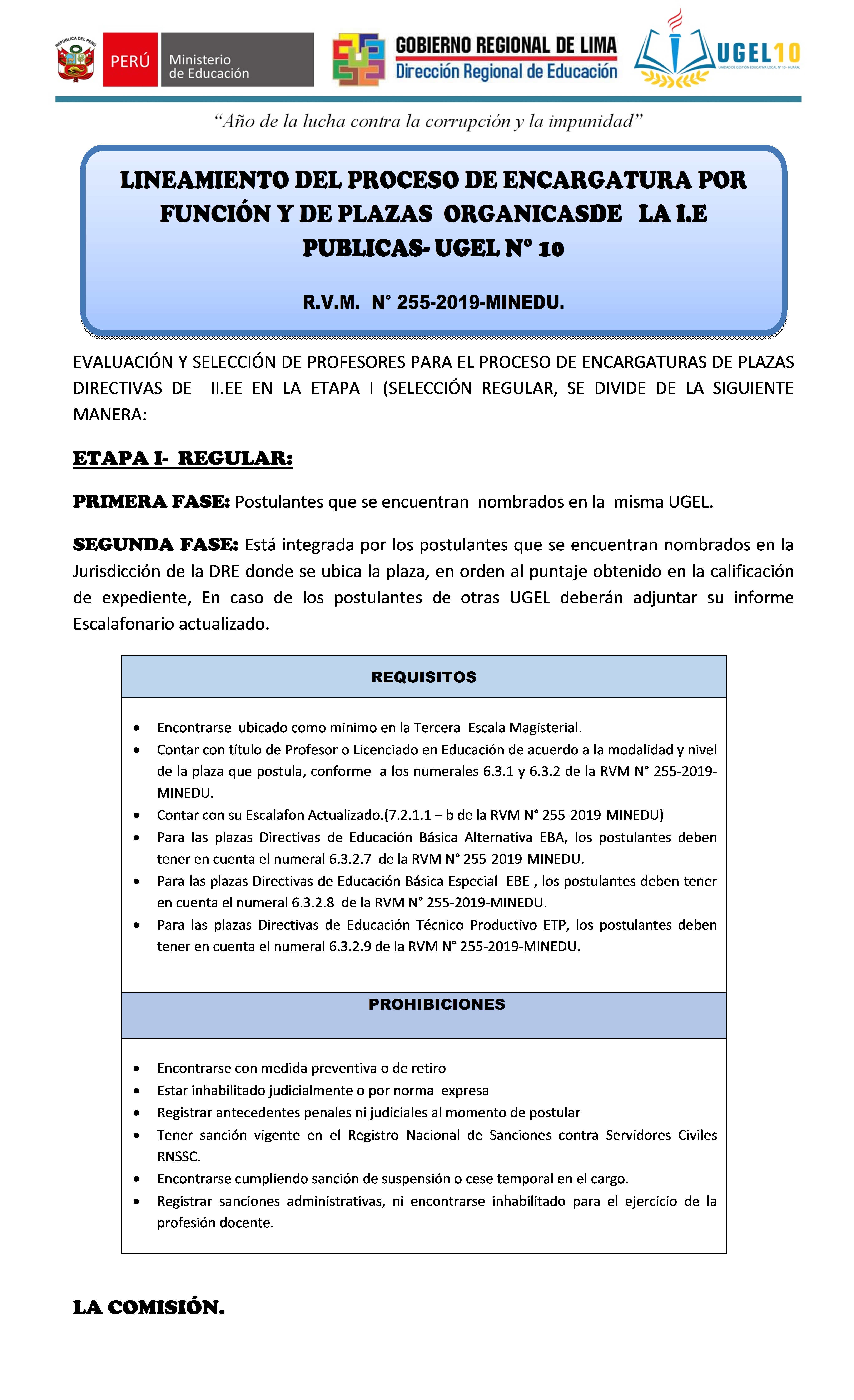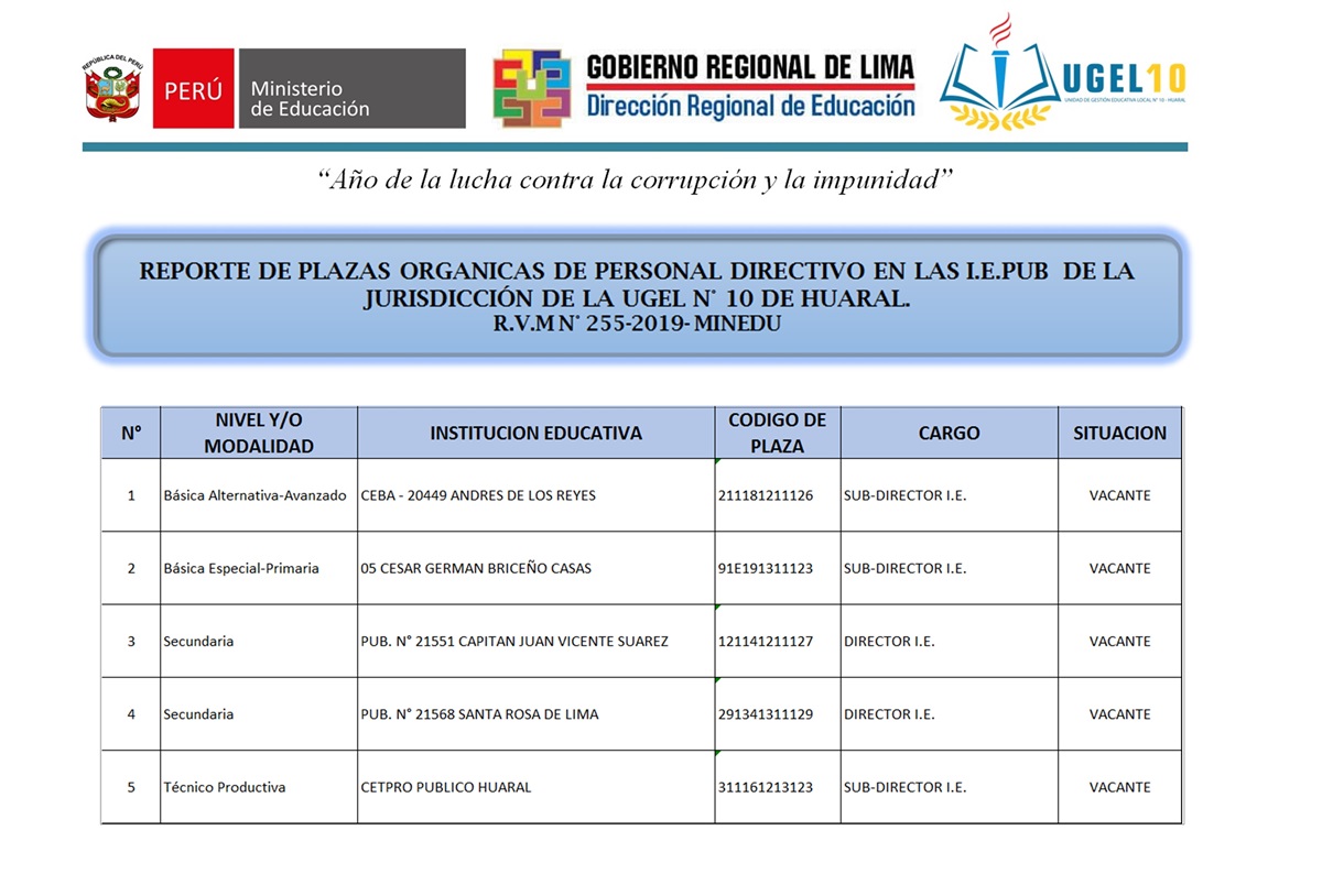 11 Nov,2019 Convocatorias COMMENTS Proceso de Encargatura de Plazas Orgánicas y por Funciones a Cargos Directivos de la I.E Publicas - UGEL N° 10.