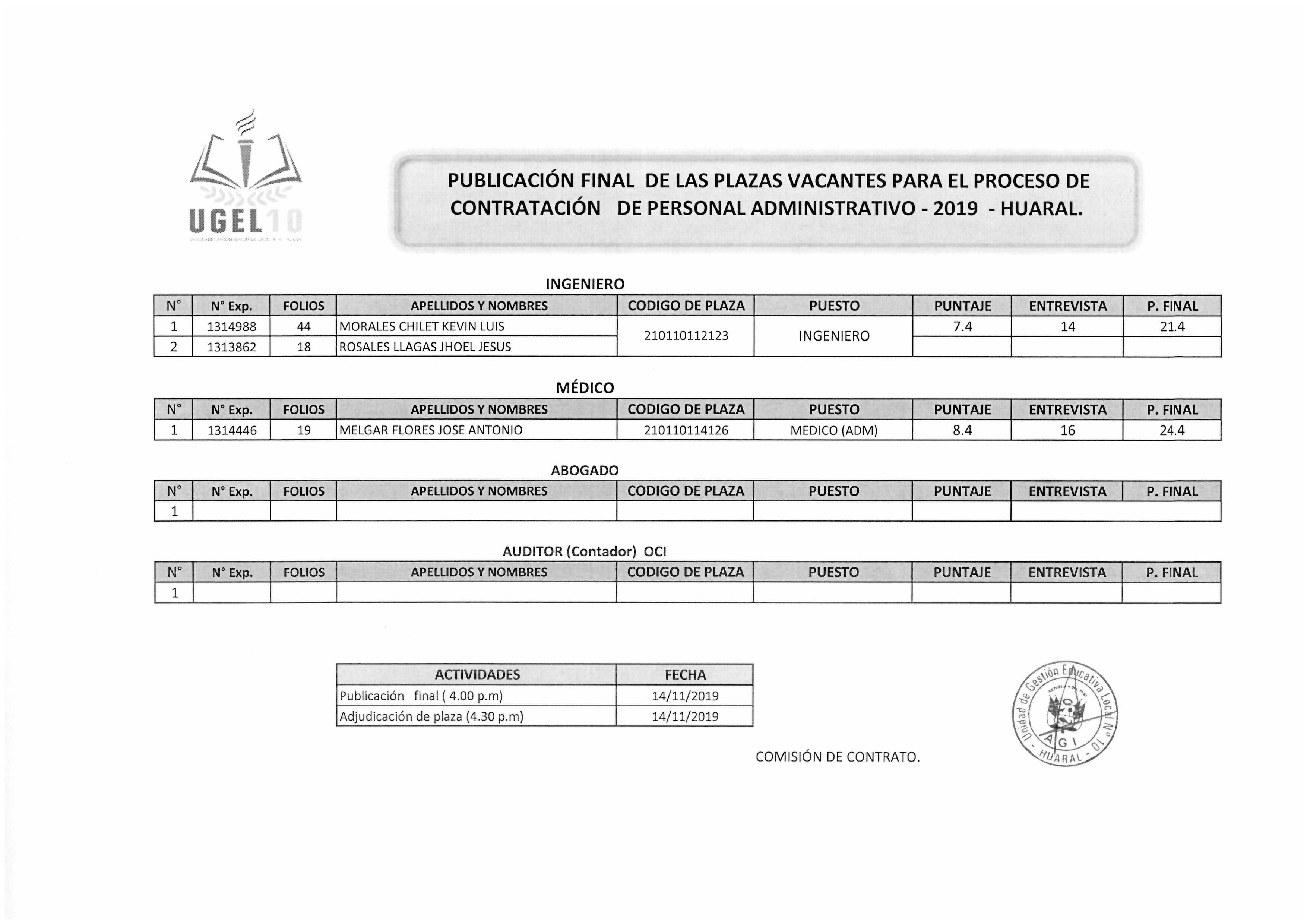 14 Nov,2019 Convocatorias COMMENTS PUBLICACIÓN FINAL DE LAS PLAZAS VACANTES PARA EL PROCESO DE CONTRATACIÓN DE PERSONAL ADMINISTRATIVO - 2019 TA