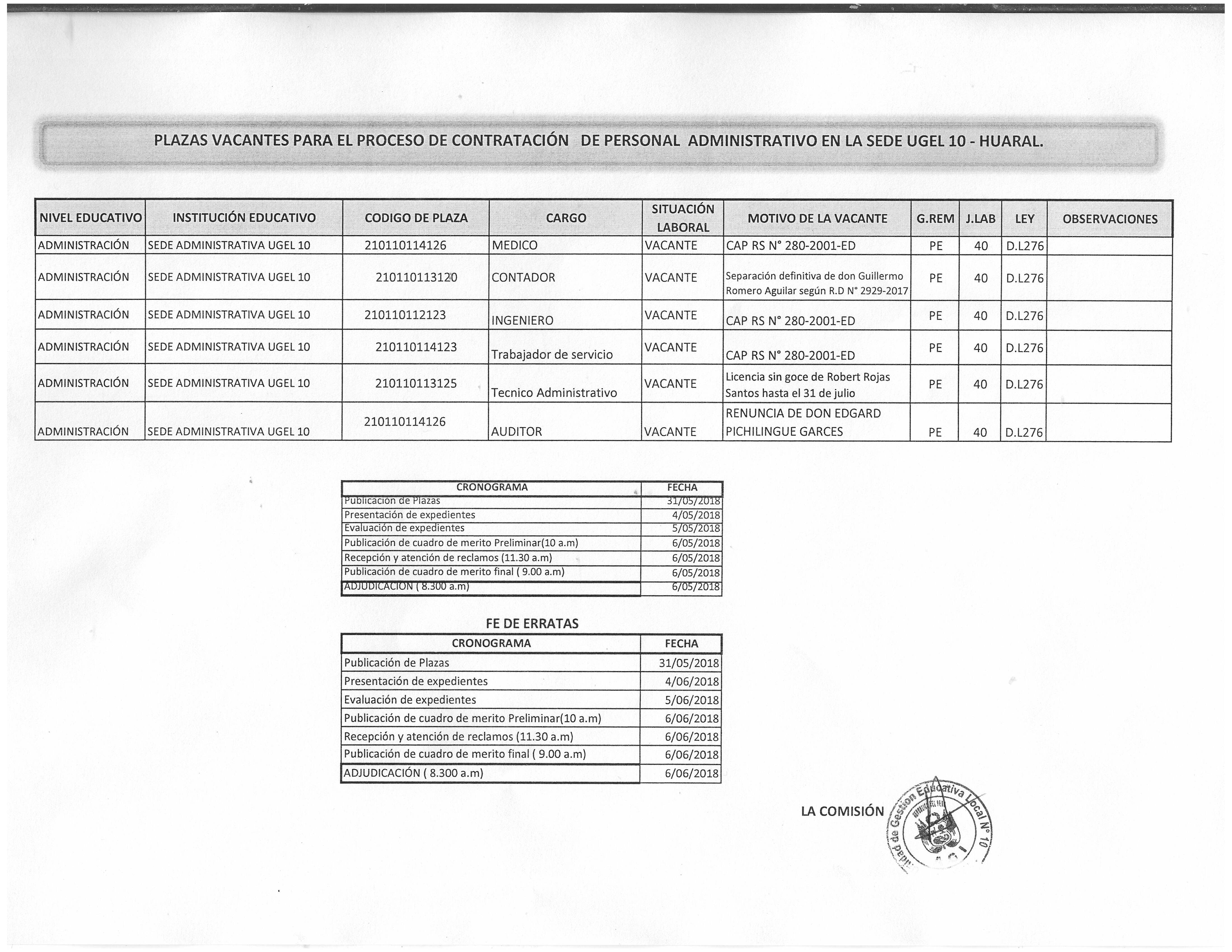 31 May,2018 Convocatorias COMMENTS Plazas Vacantes Para el Proceso de Contratación de Personal Administrativo en la Sede UGEL 10 - H.