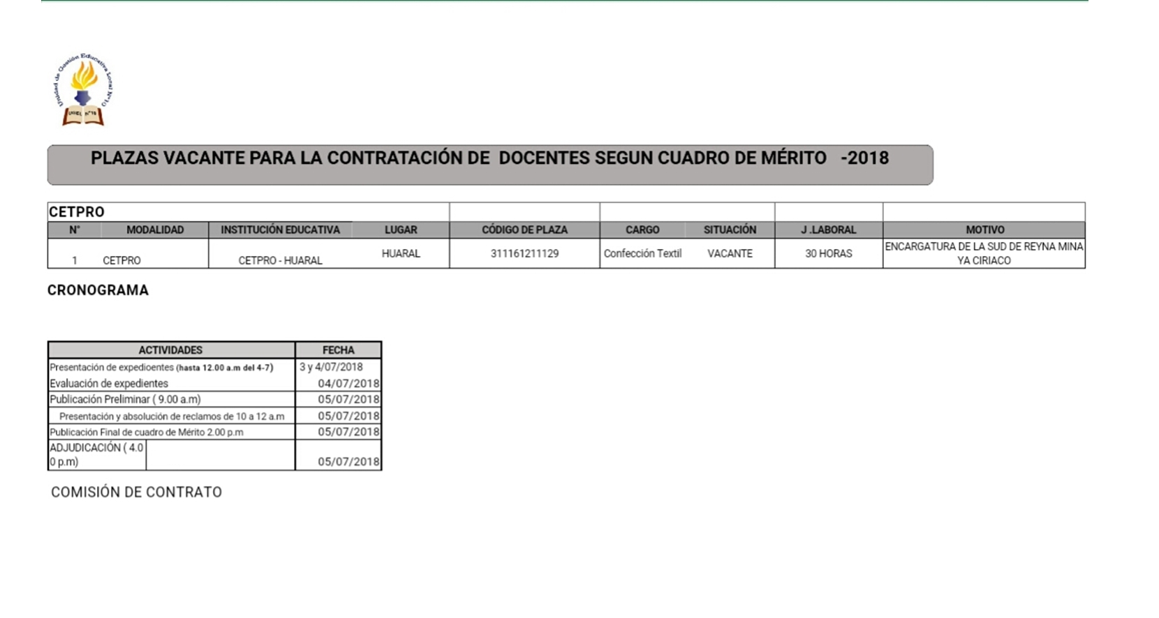 02 Jul,2018 Convocatorias COMMENTS Plaza vacante para la contratación de Docente según cuadro de mérito [Confección Textil]