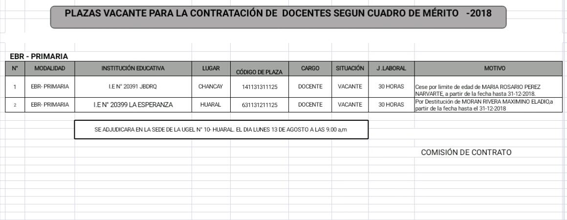 10 Ago,2018 Convocatorias COMMENTS Plaza Vacante para la Contratación de Docente de EBR Primaria según Cuadro de Mérito.