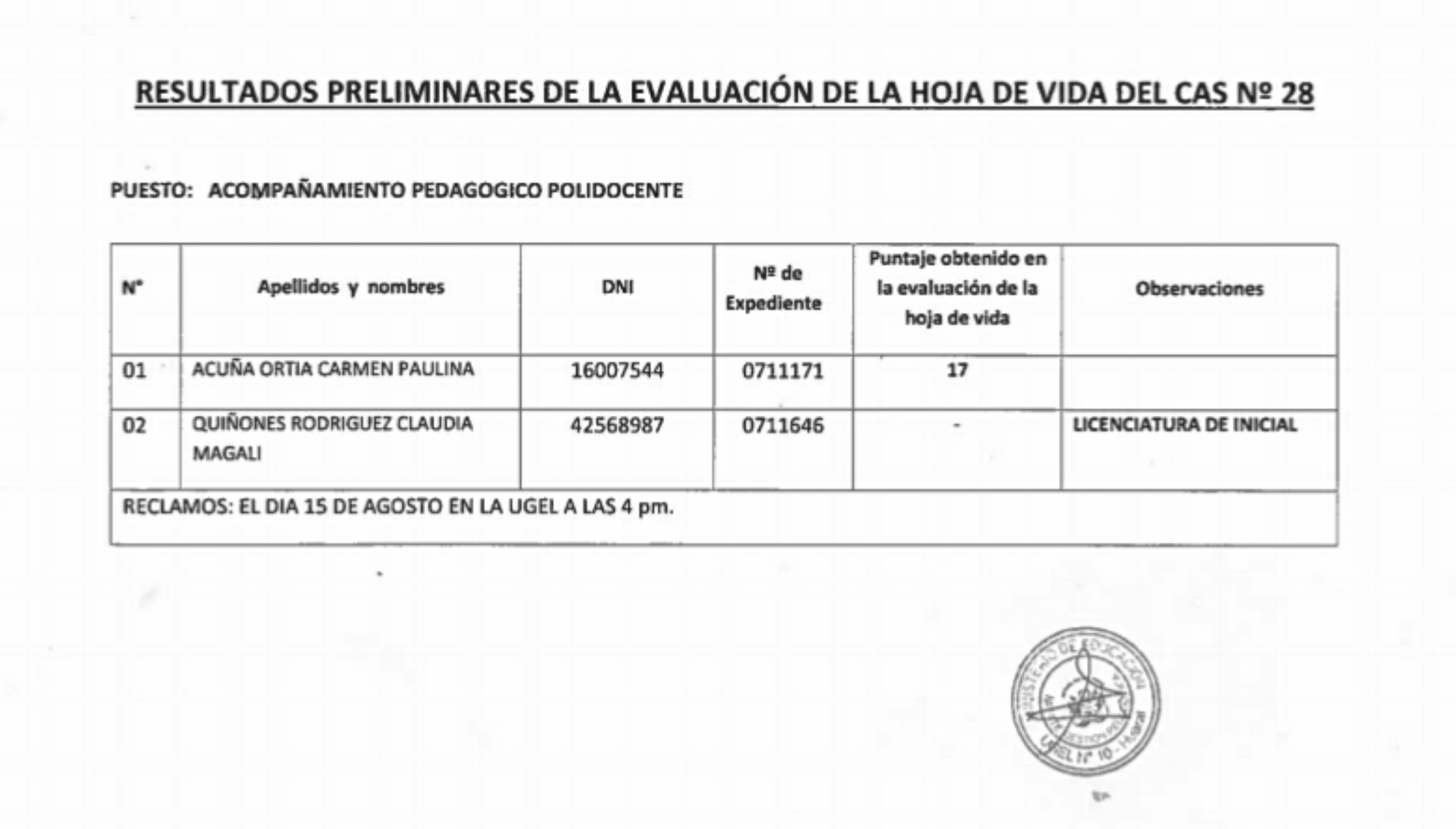 14 Ago,2018 Convocatorias COMMENTS CAS 28 - Resultados Preliminares de la Evaluación de la Hoja de Vida