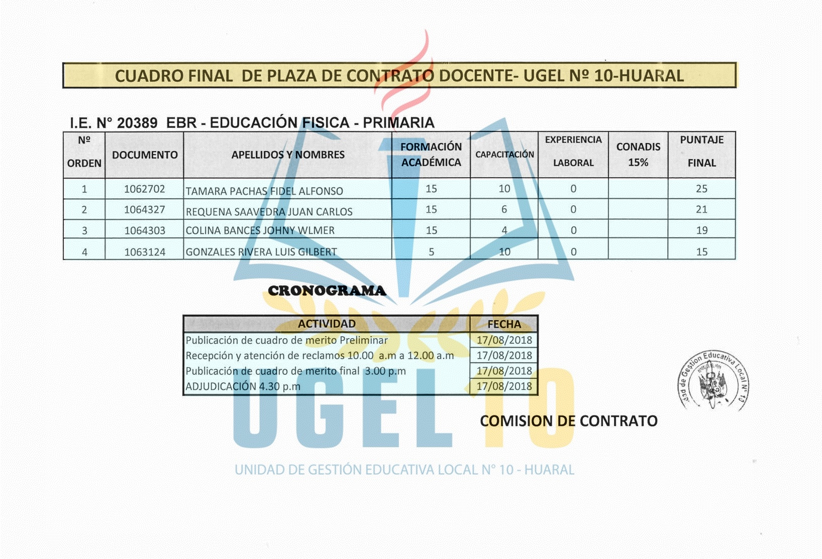 17 Ago,2018 Convocatorias COMMENTS Cuadro Final de Plaza de Contrato Docente - I.E 20389 EBR [Educ. Física - Primaria]