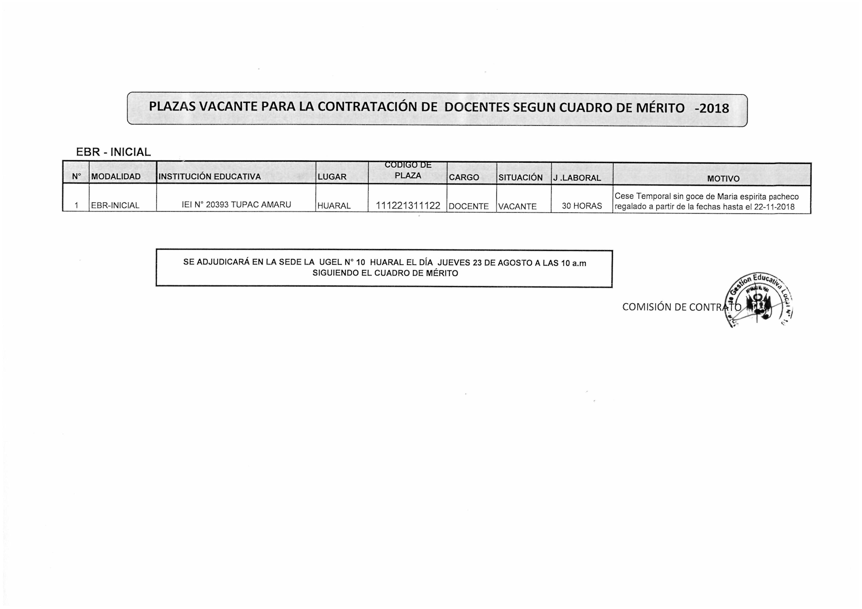 22 Ago,2018 Convocatorias COMMENTS PLAZA VACANTE PARA LA CONTRATACIÓN DE DOCENTES SEGUN CUADRO DE MÉRITO. EBR-INICIAL