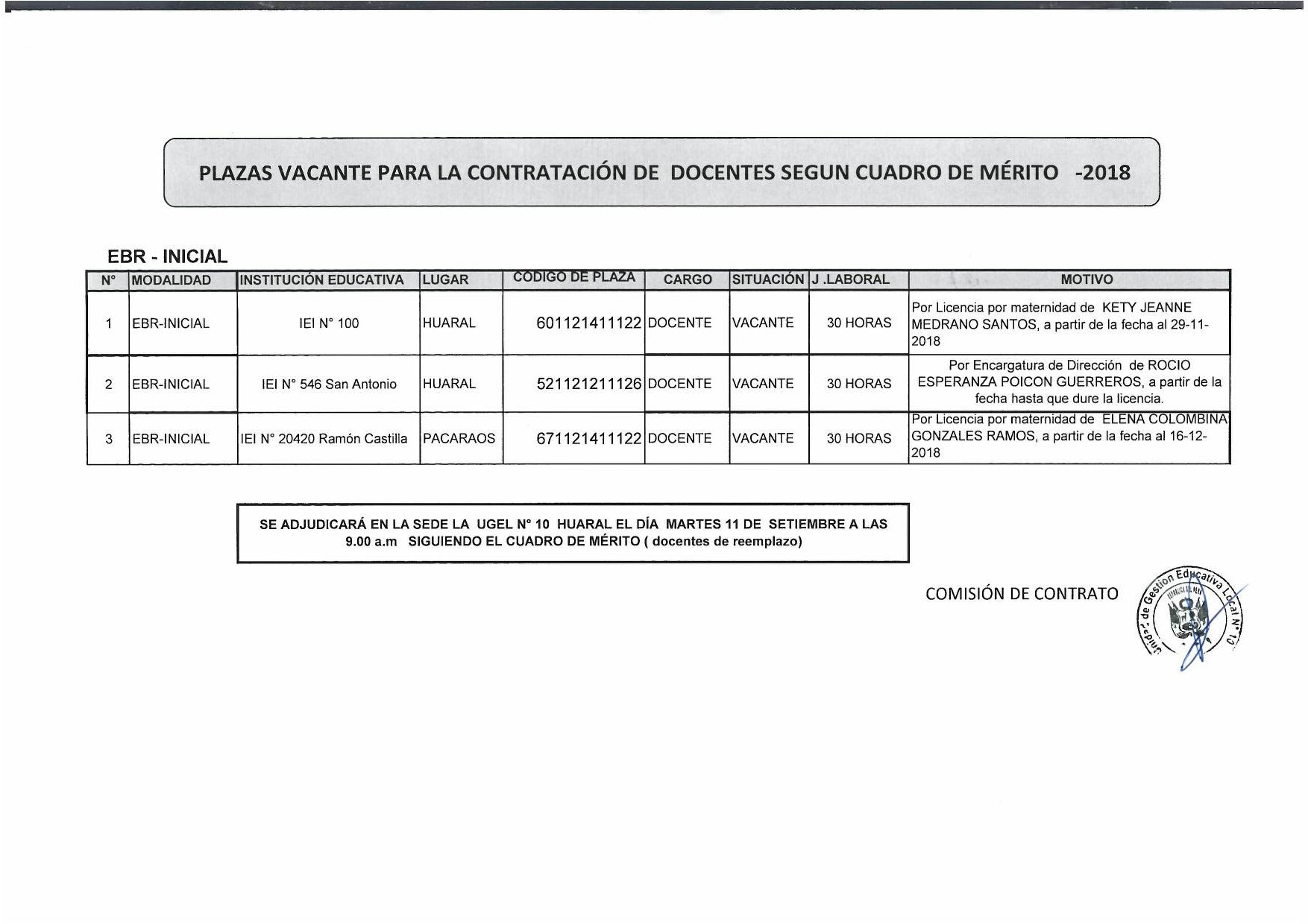 10 Sep,2018 Convocatorias COMMENTS PLAZAS VACANTE PARA LA CONTRATACIÓN DE DOCENTES SEGÚN CUADRO DE MERITO. EBR-INICIAL