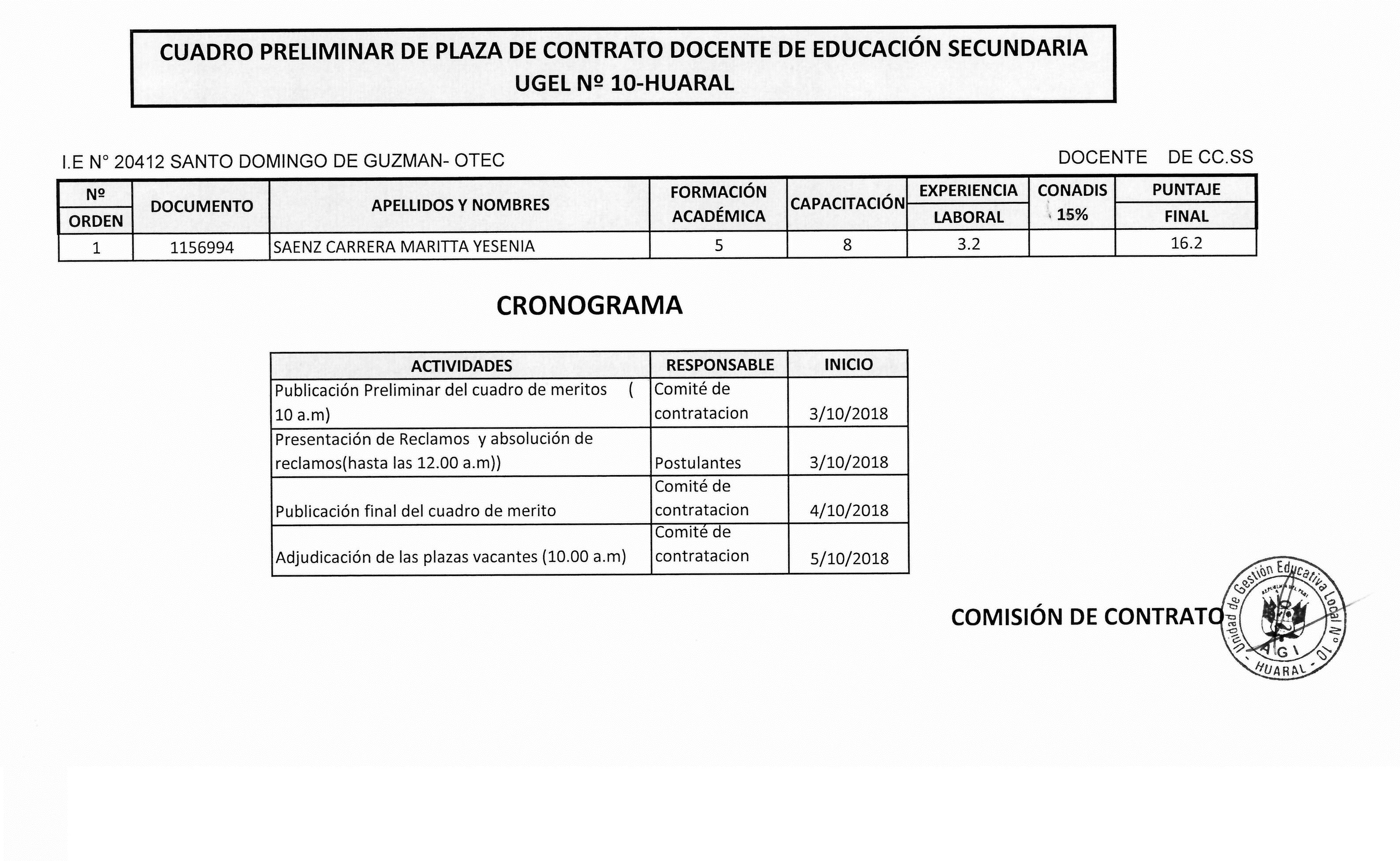 03 Oct,2018 Convocatorias COMMENTS Cuadro Preliminar de Plaza de Contrato Docente de Educación Secundaria - I.E N°20412.