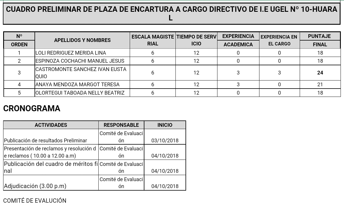 03 Oct,2018 Convocatorias COMMENTS Cuadro Preliminar de Plaza de Encargatura al cargo de Directivo de I.E