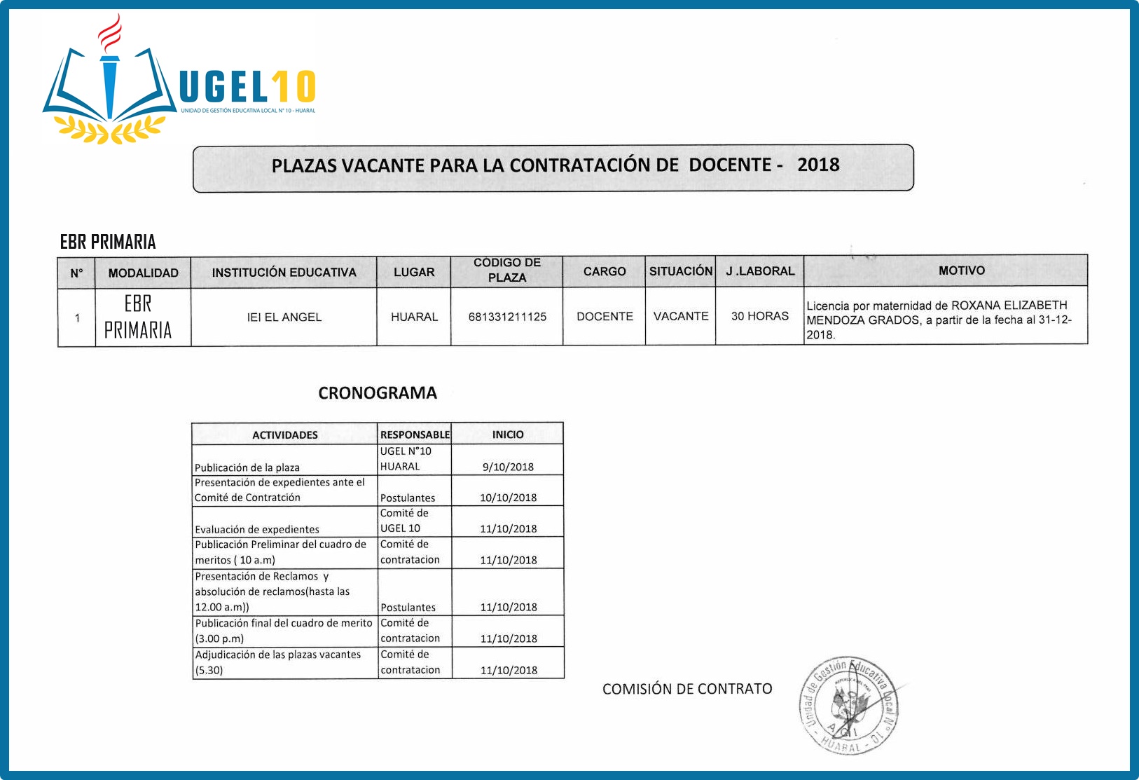 09 Oct,2018 Convocatorias COMMENTS Plaza Vacante para la Contratación de Docente en I.E. "El Ángel" [EBR Primaria]