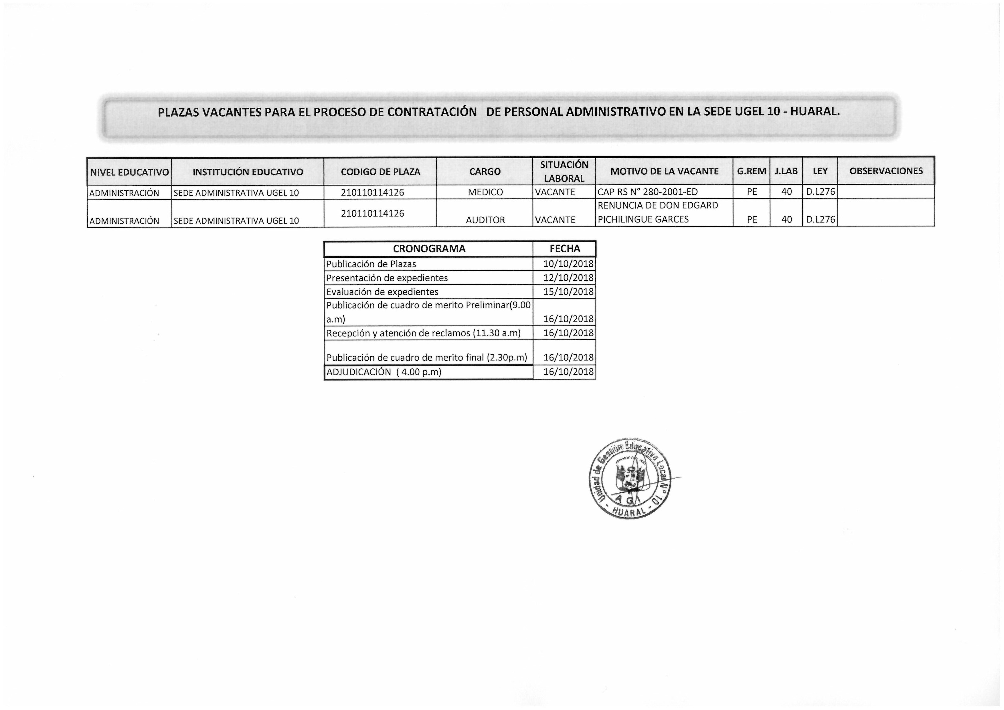 10 Oct,2018 Convocatorias COMMENTS PLAZAS VACANTES PARA EL PROCESO DE CONTRATACIÓN DE PERSONAL ADMINISTRATIVO EN LA SEDE UGEL 10