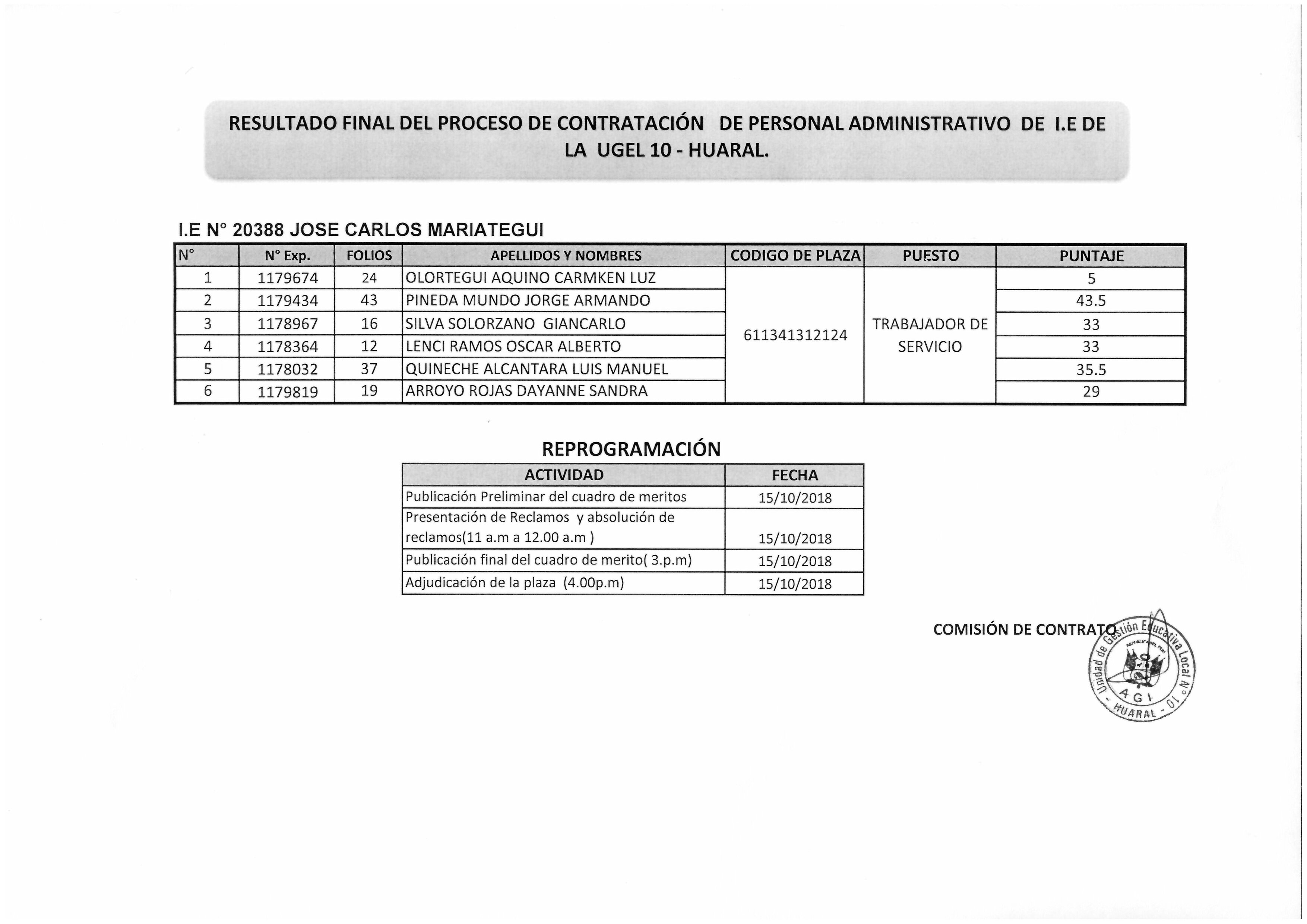 15 Oct,2018 Convocatorias COMMENTS RESULTADO FINAL DEL PROCESO DE CONTRATACIÓN DE PERSONAL ADMINISTRATIVO DE I.E .