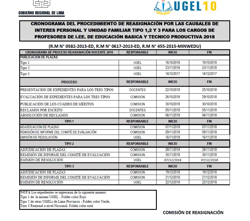 18 Oct,2018 Convocatorias COMMENTS Cronograma del Procedimiento de Reasignación por las Causales de Interés Personal y Unidad Familiar Tipo 1, 2 y 3 para los cargos de Profesores de II.EE de Educ. Básica y Técnico Productiva 2018 ver y descargar anexos