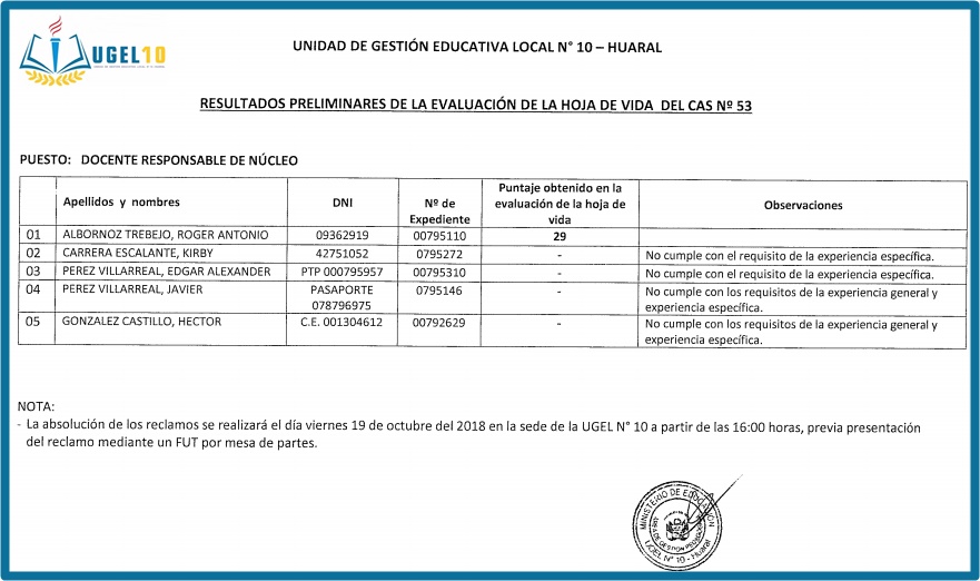 18 Oct,2018 Convocatorias COMMENTS CAS 53 - Resultados Preliminares de la Evaluación de la Hoja de Vida.