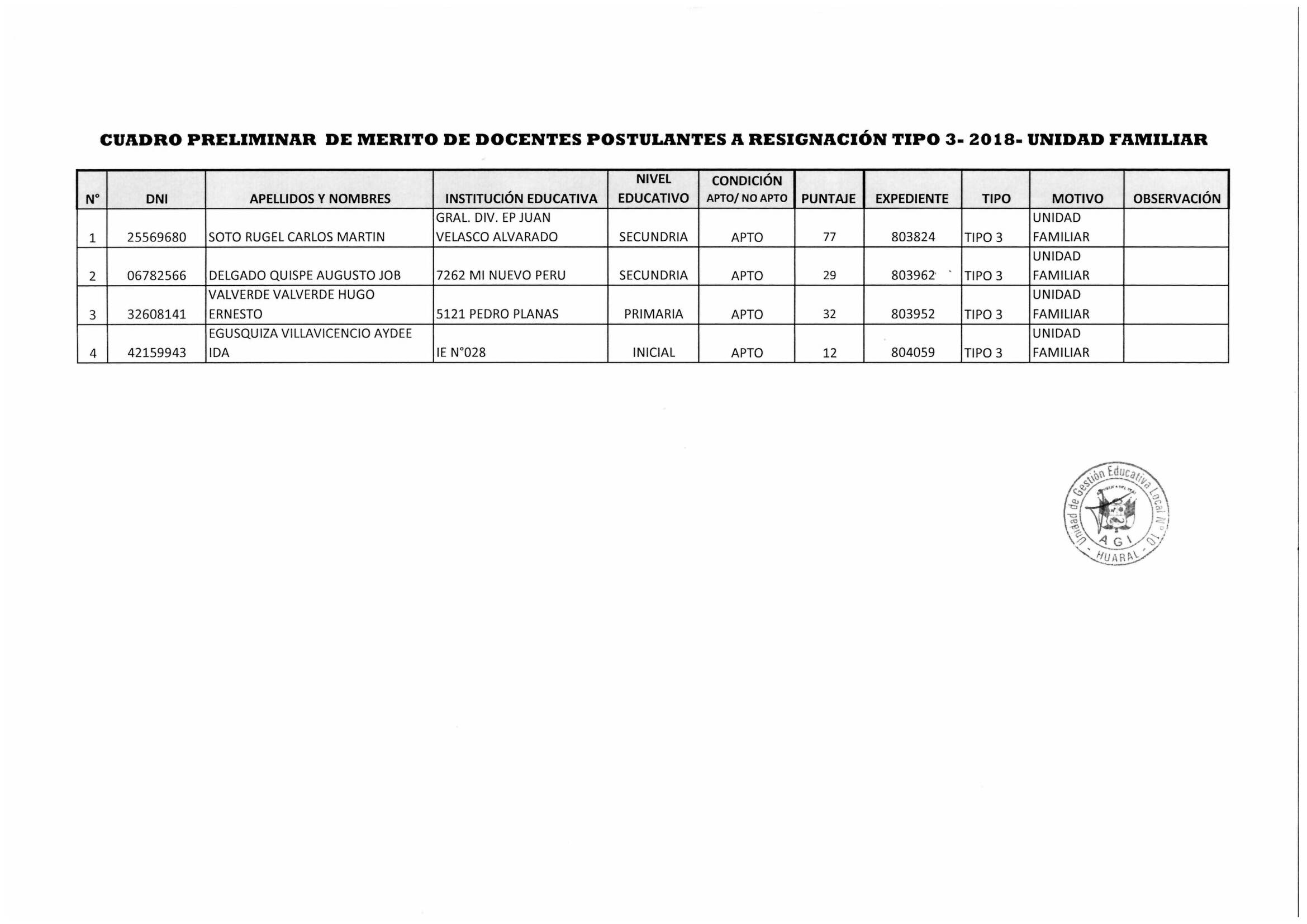 05 Nov,2018 Convocatorias COMMENTS CUADRO PRELIMINAR DE MERITO DE DOCENTES POSTULANTES A REASIGNACIÓN TIPO 3 - 2018 - UNIDAD FAMILIAR