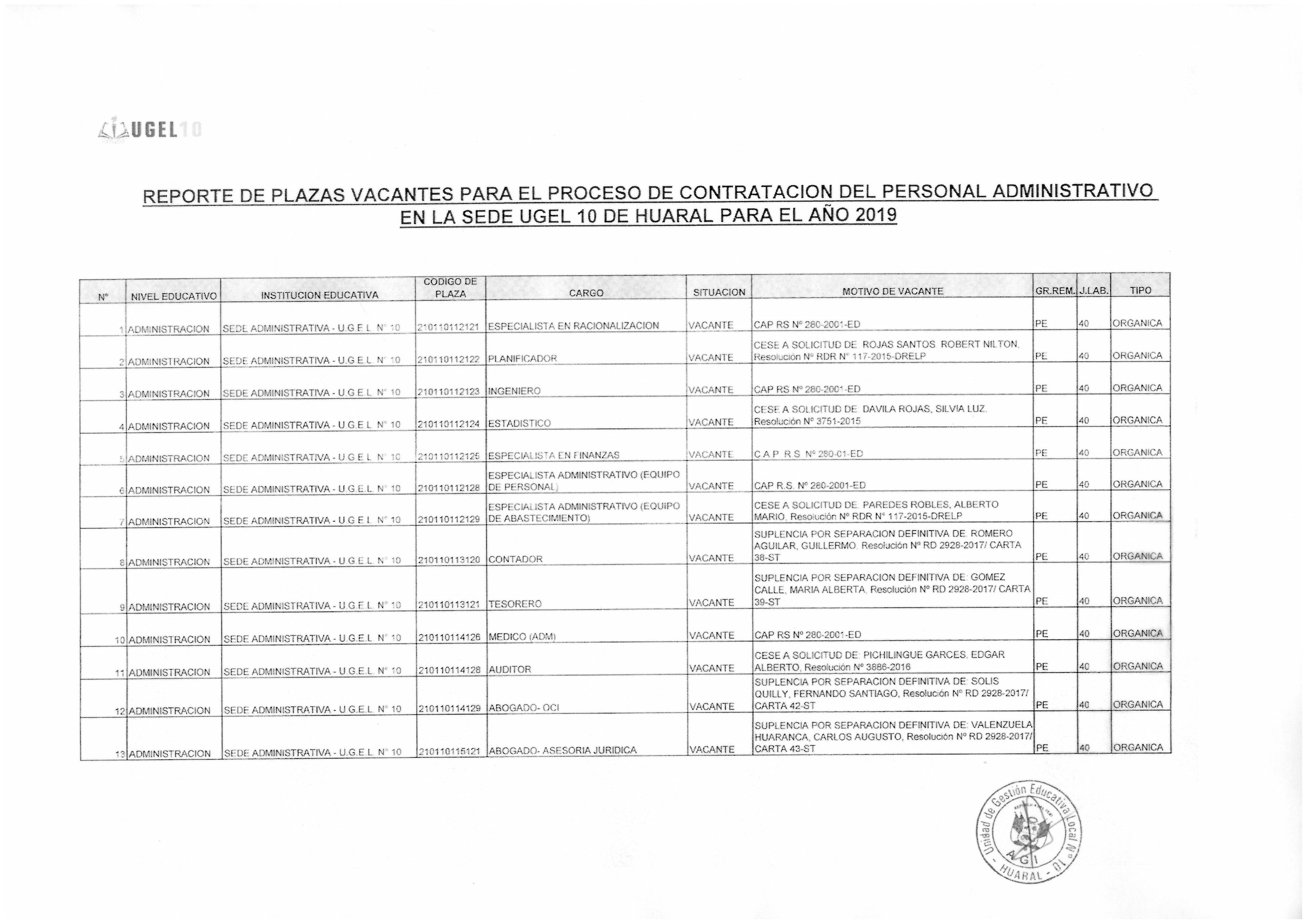 03 Dic,2018 Convocatorias COMMENTS REPORTE DE PLAZAS VACANTES PARA EL PROCESO DE CONTRATACIÓN DE PERSONAL ADMINISTRATIVO EN LA SEDE UGEL 10 DE HUARAL PARA EL AÑO 2019