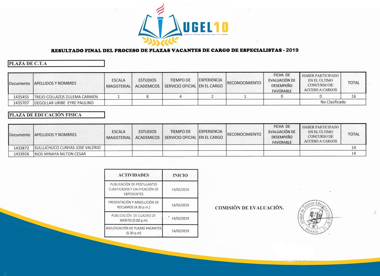 14 Feb,2019 Convocatorias COMMENTS Resultado Final del Proceso de Plazas Vacantes de Cargo de Especialistas 2019