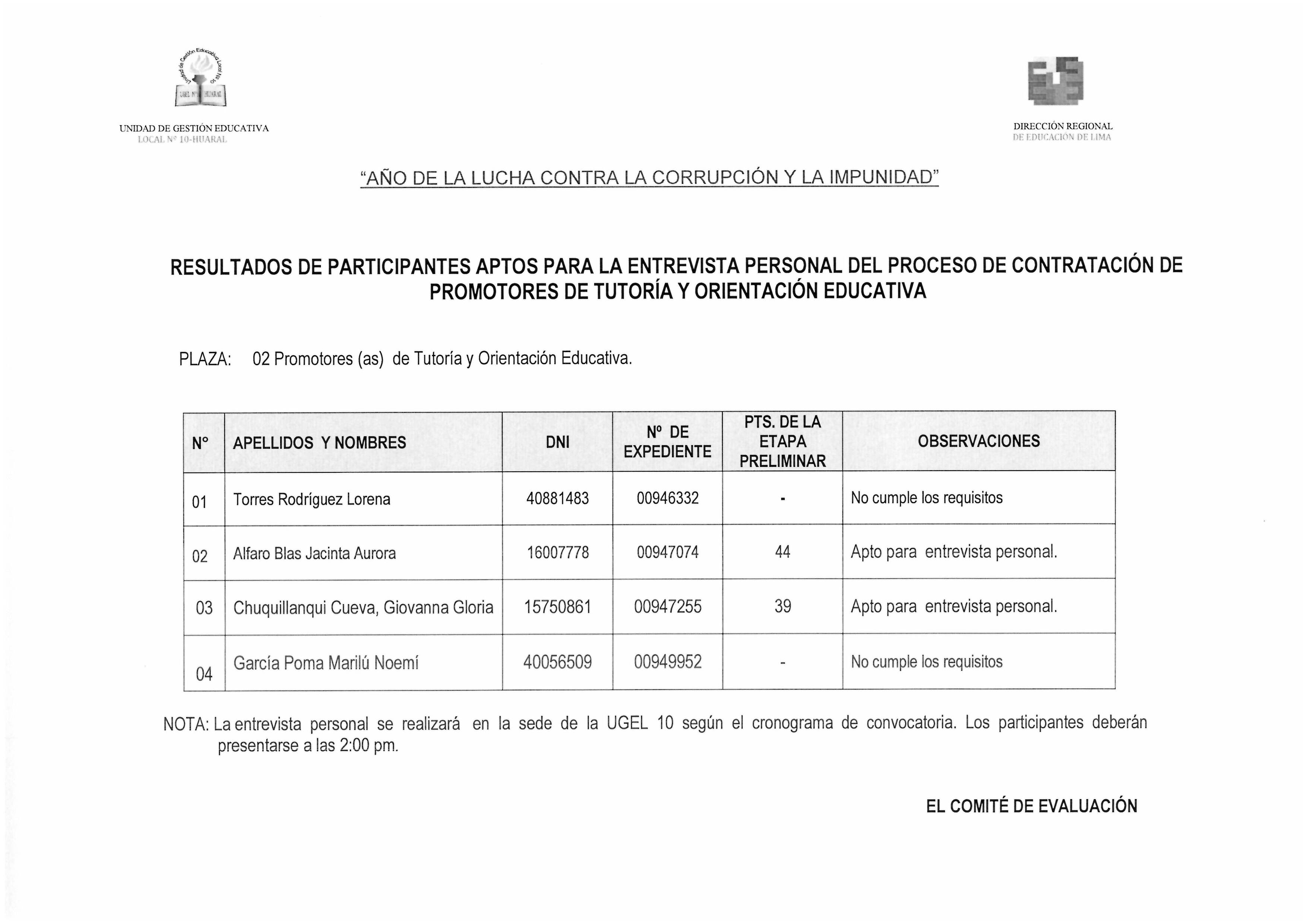 18 Feb,2019 Convocatorias COMMENTS RESULTADOS DE PARTICIPANTES APTOS PARA LA ENTREVISTA PERSONAL DEL PROCESO DE CONTRATACIÓN DE PROMOTORES DE TUTORÍA Y ORIENTACIÓN EDUCATIVA