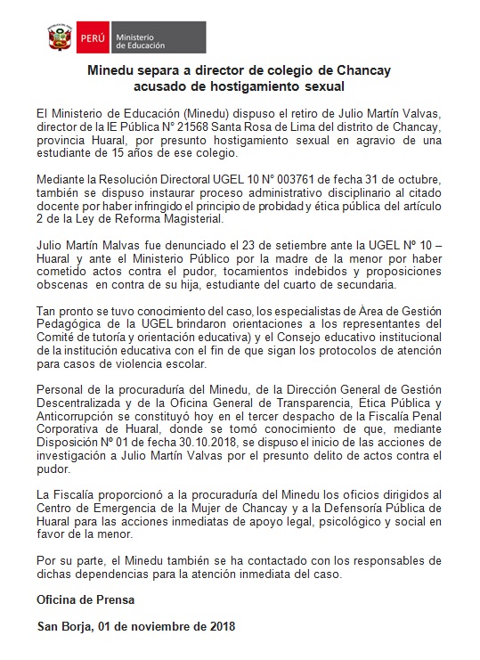 01 Nov,2018 Noticias COMMENTS MINEDU separa a director de colegio de Chancay acusado de hostigamiento sexual.