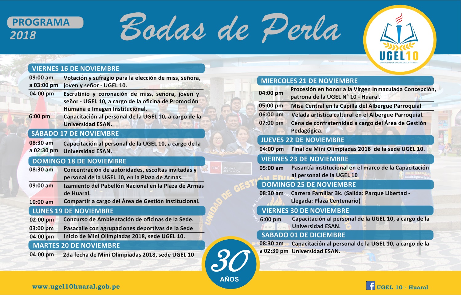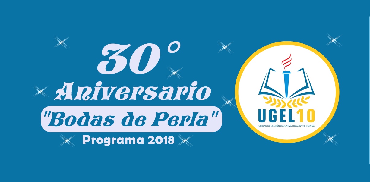 18 Nov,2018 Noticias COMMENTS 30° Aniversario de la UGEL 10 "Bodas de Perla". En el marco de aniversario la UGEL 10 programó las siguientes actividades